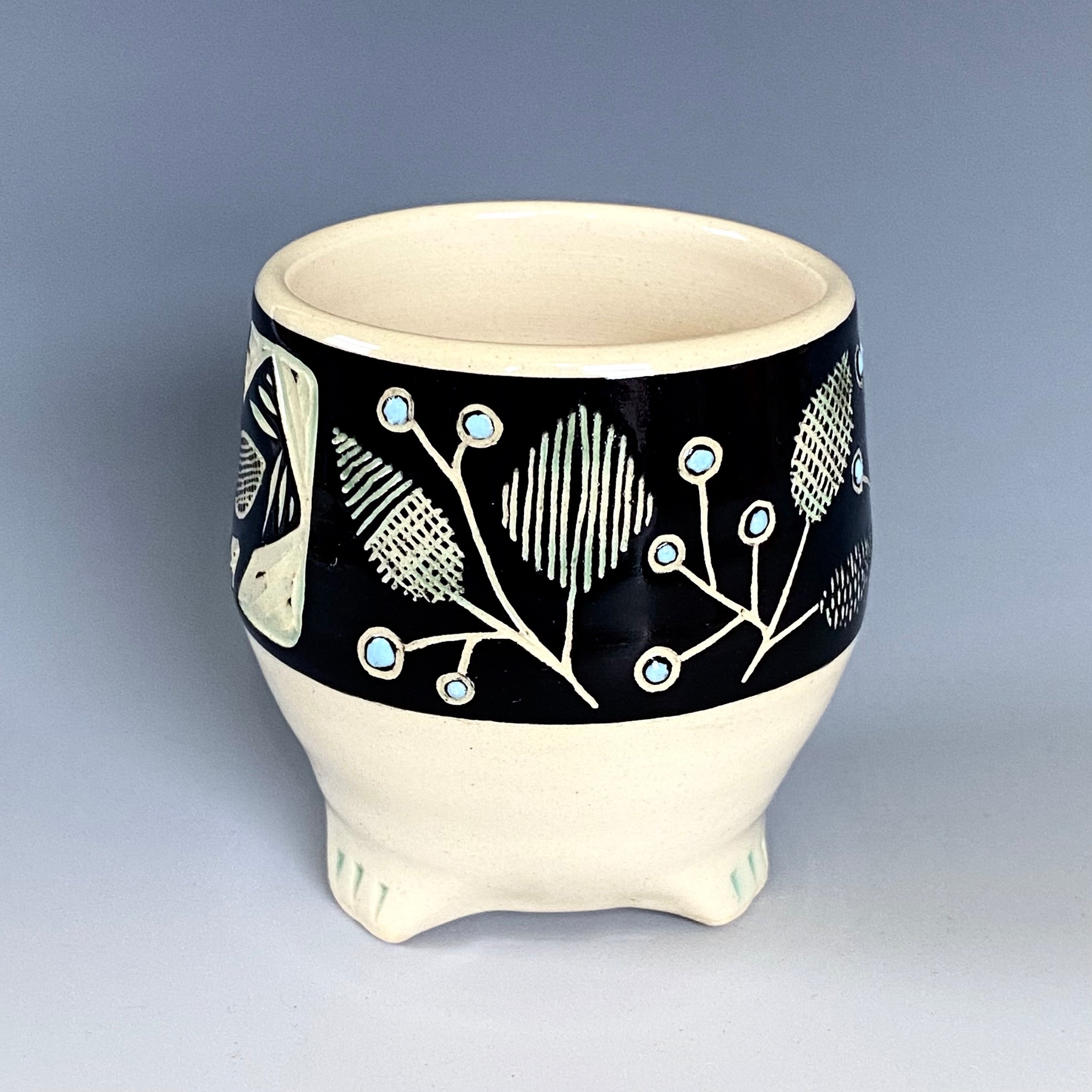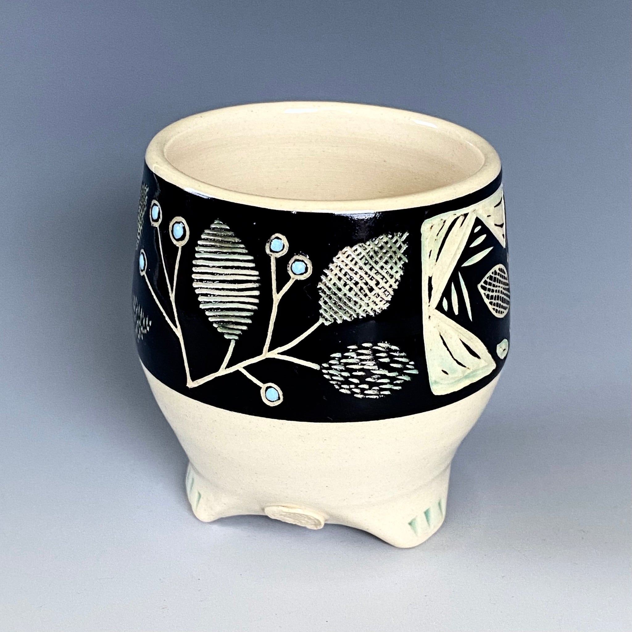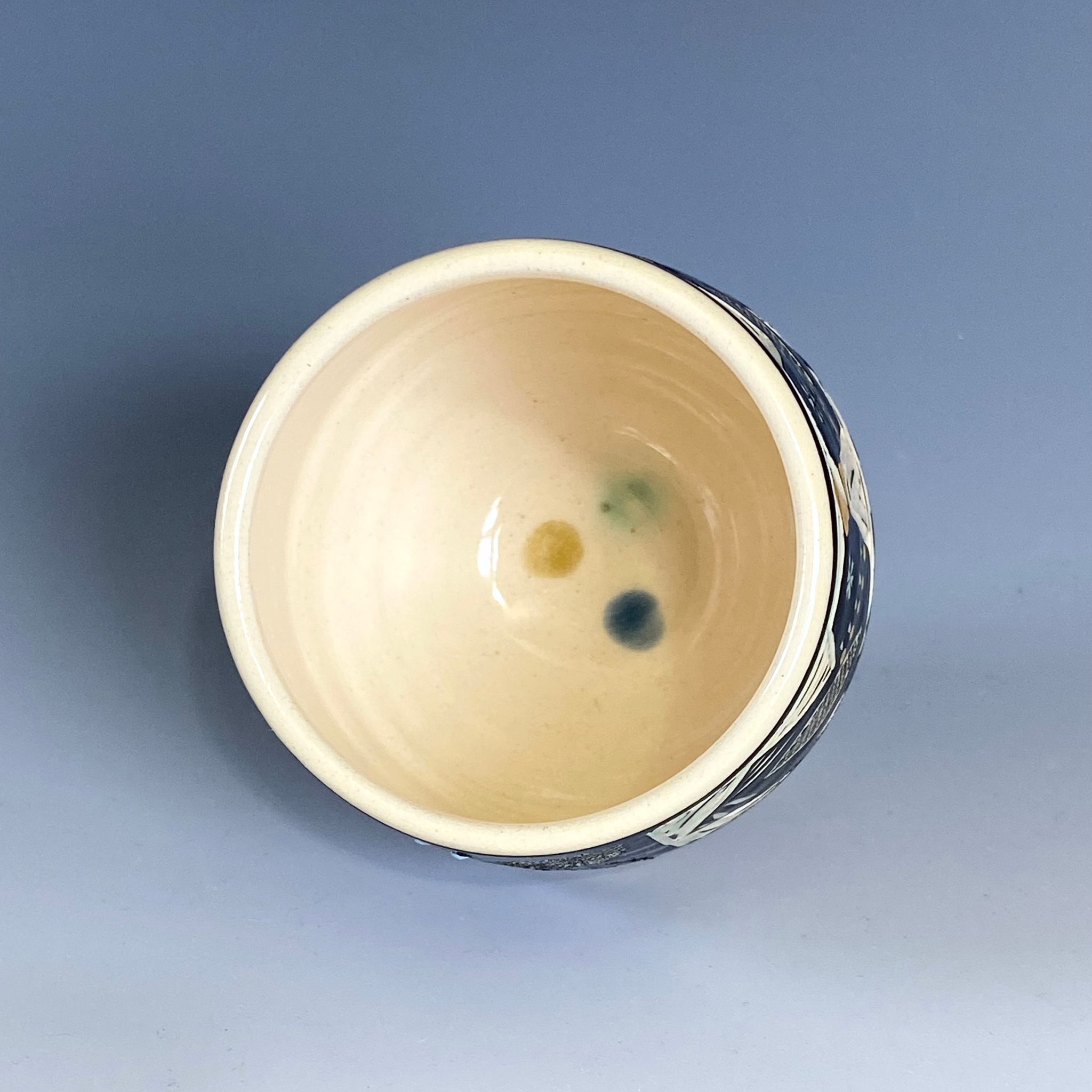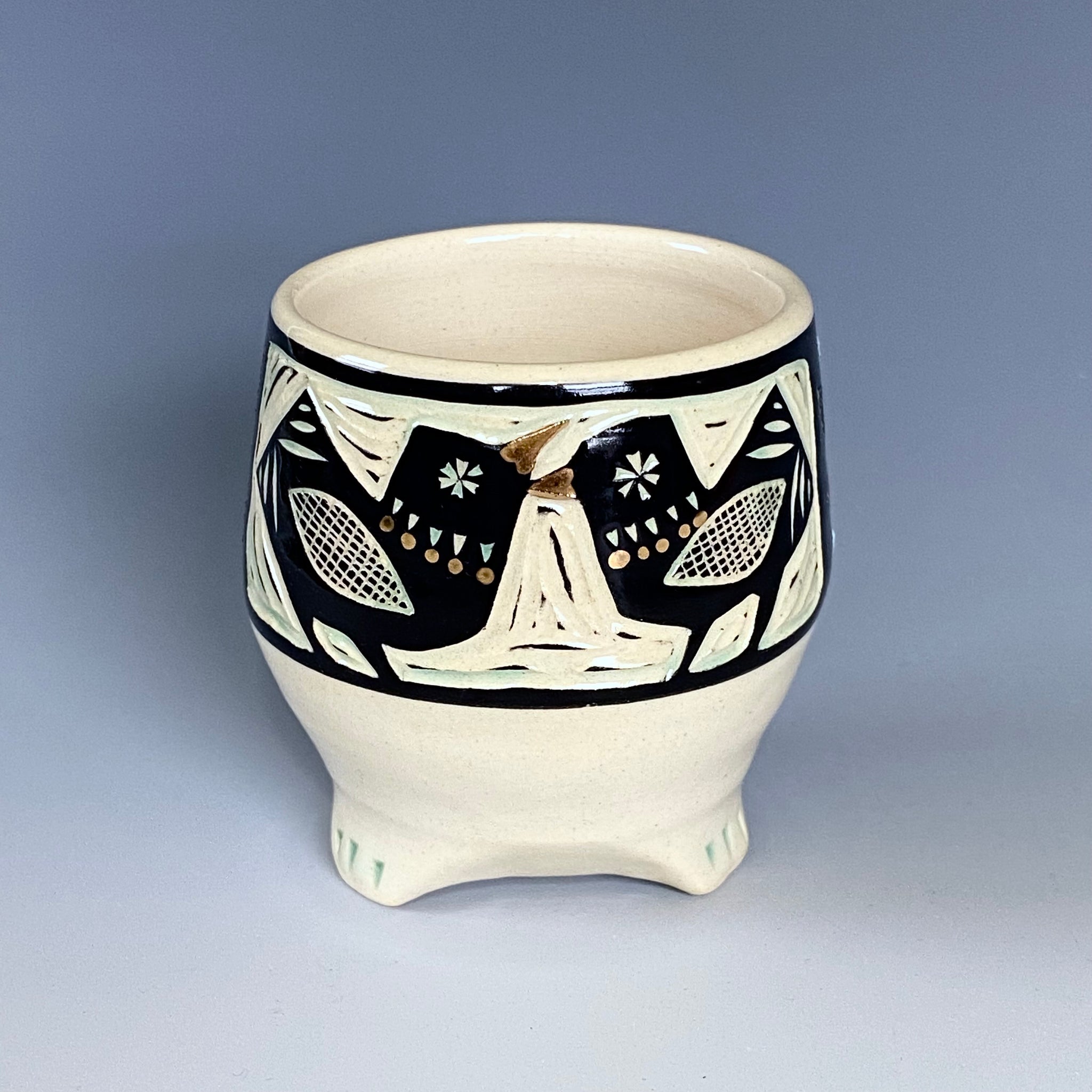 White stoneware with black underglaze, color glaze, sgraffito and gold luster decoration. With lead-free glaze is fully functional ware. Dishwasher safe but due to the metallic luster it must not be microwaved.