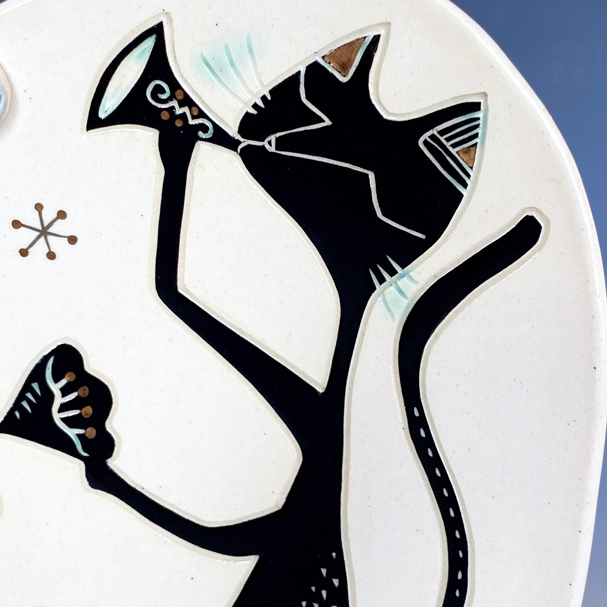 White stoneware with black underglaze, colorglaze, sgraffito, and gold luster decoration. With lead-free glaze is fully functional ware. Dishwasher safe but due to the metallic luster it must not be microwaved.