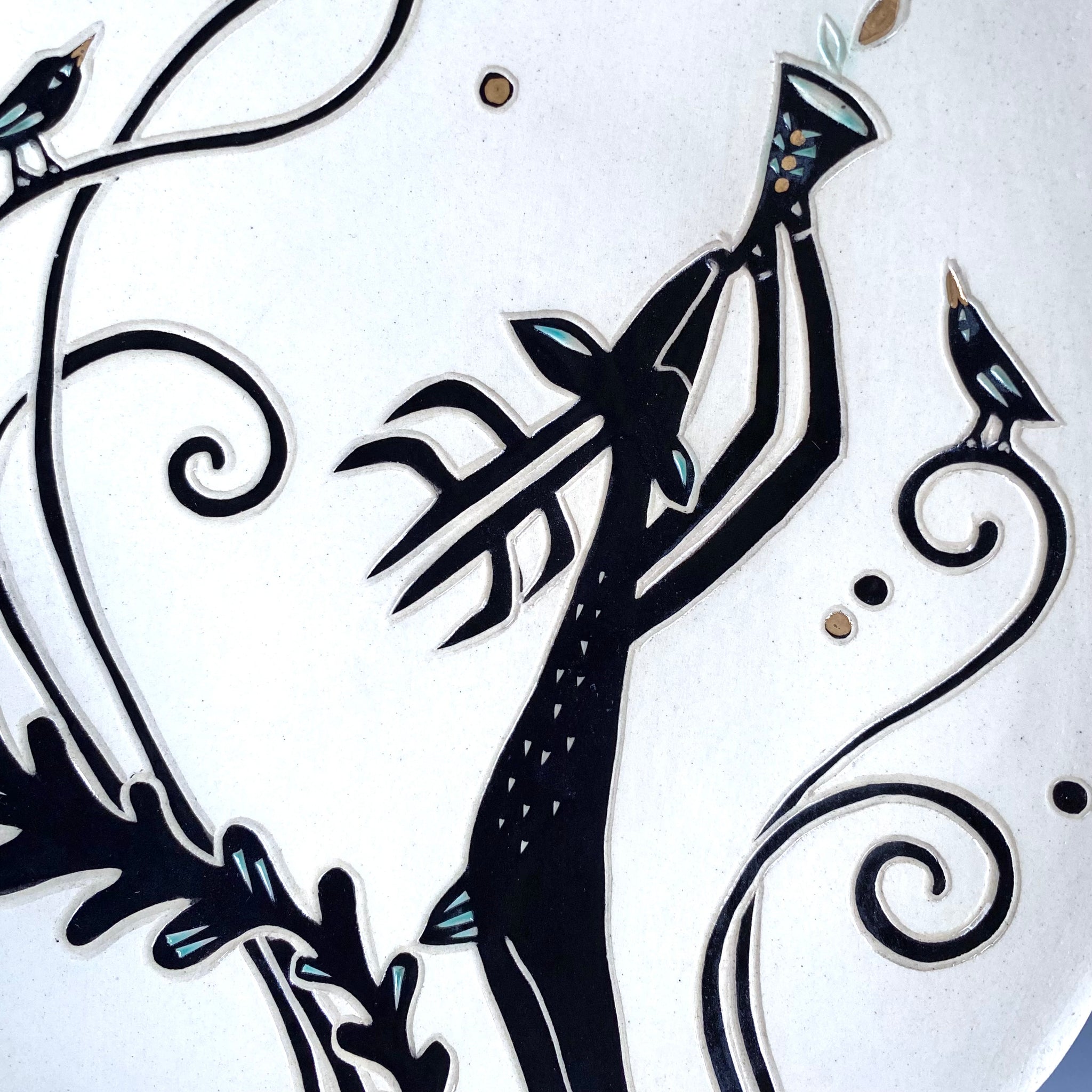 White stoneware with black underglaze, color glaze, sgraffito and gold luster decoration. With lead-free glaze is fully functional ware. Dishwasher safe but due to the metallic luster it must not be microwaved.