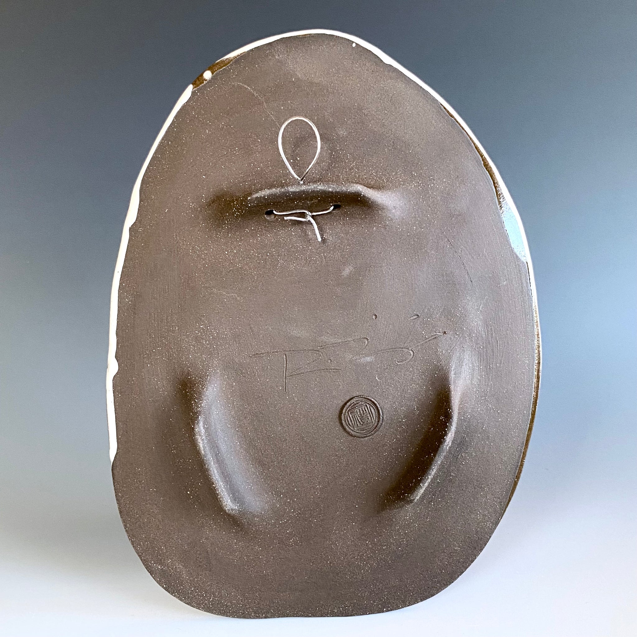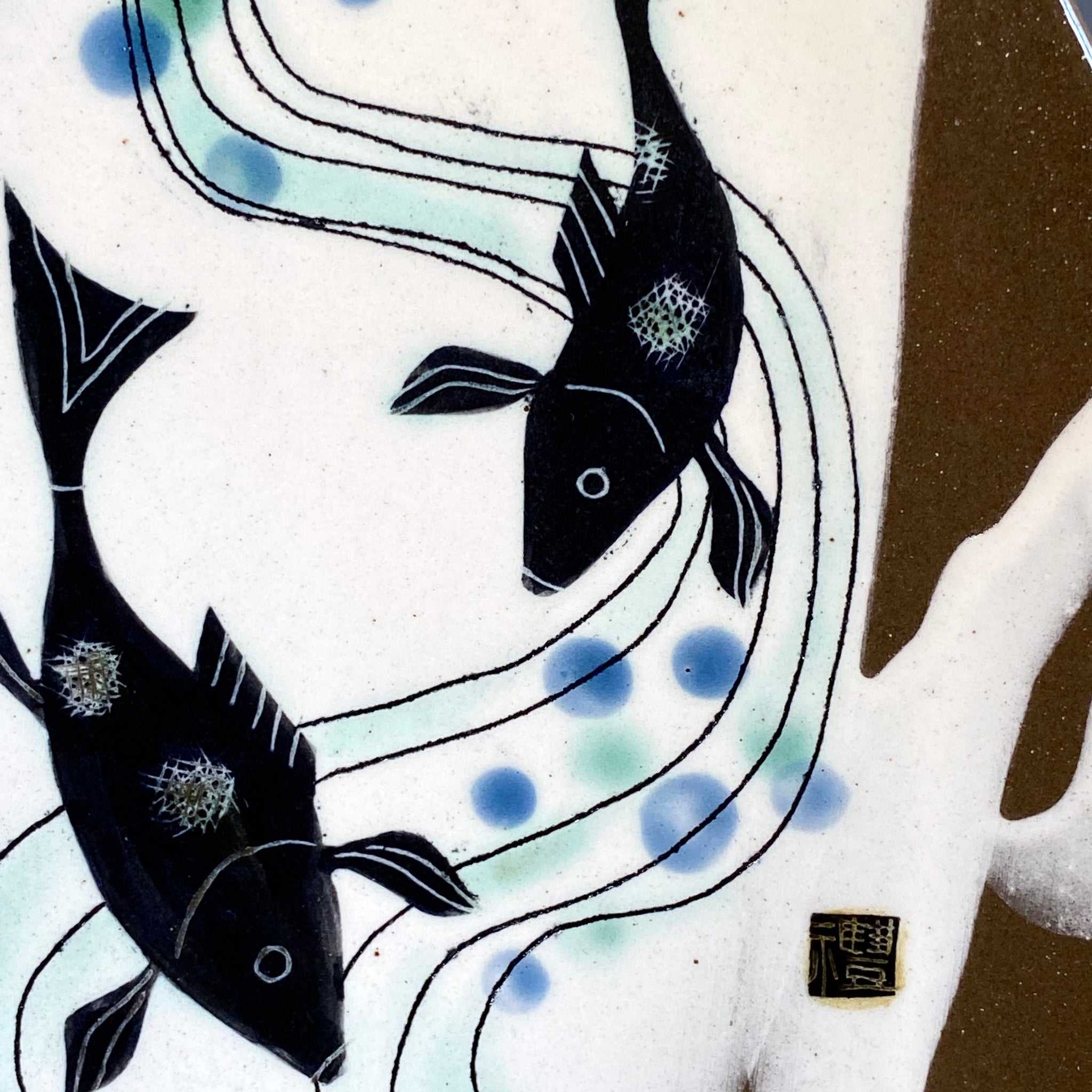 Brown stoneware with white slip, black underglaze, color glaze, line inlay, and sgraffito decoration.
