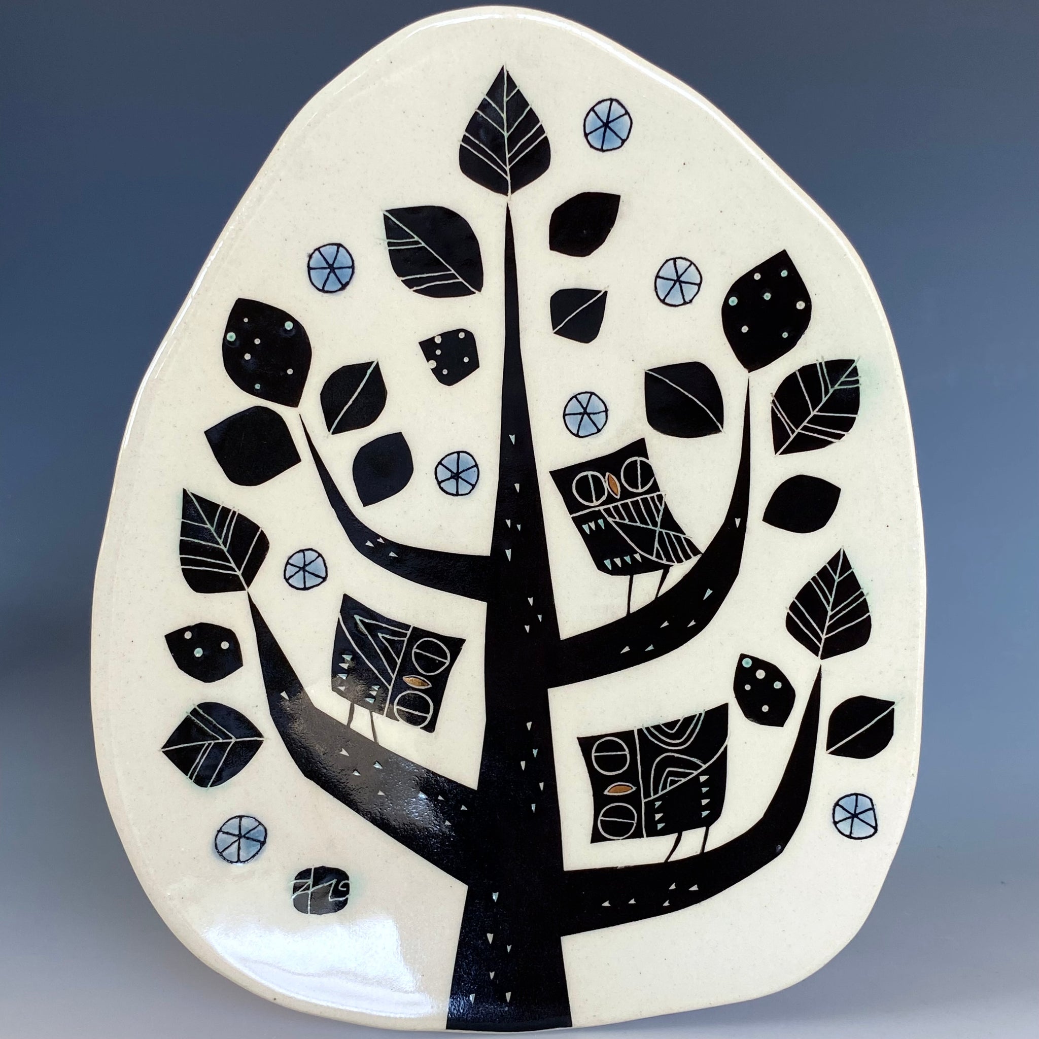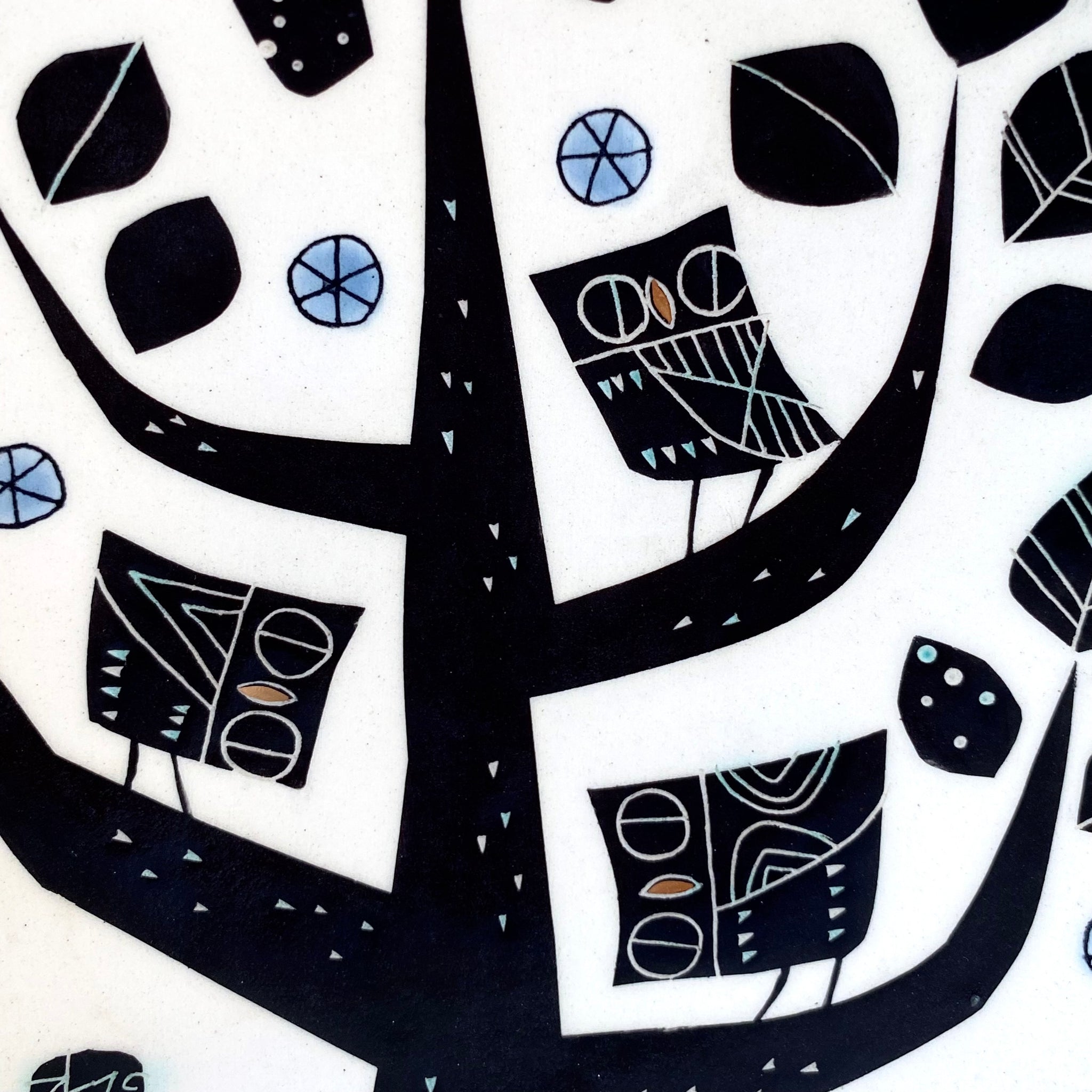 White stoneware with black underglaze, colorglaze, line-inlay, sgraffito, and gold luster decoration. With lead-free glaze is fully functional ware. Dishwasher safe but due to the metallic luster it must not be microwaved.