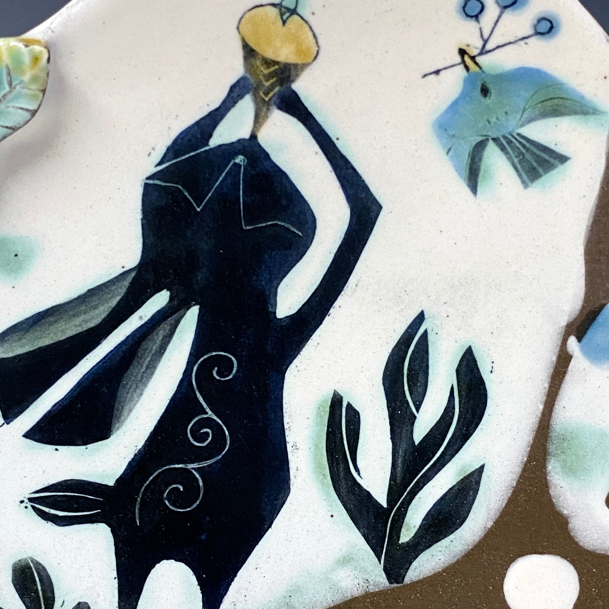 Brown stoneware with white slip, black underglaze, glaze stain, line inlay, and sgraffito decoration.