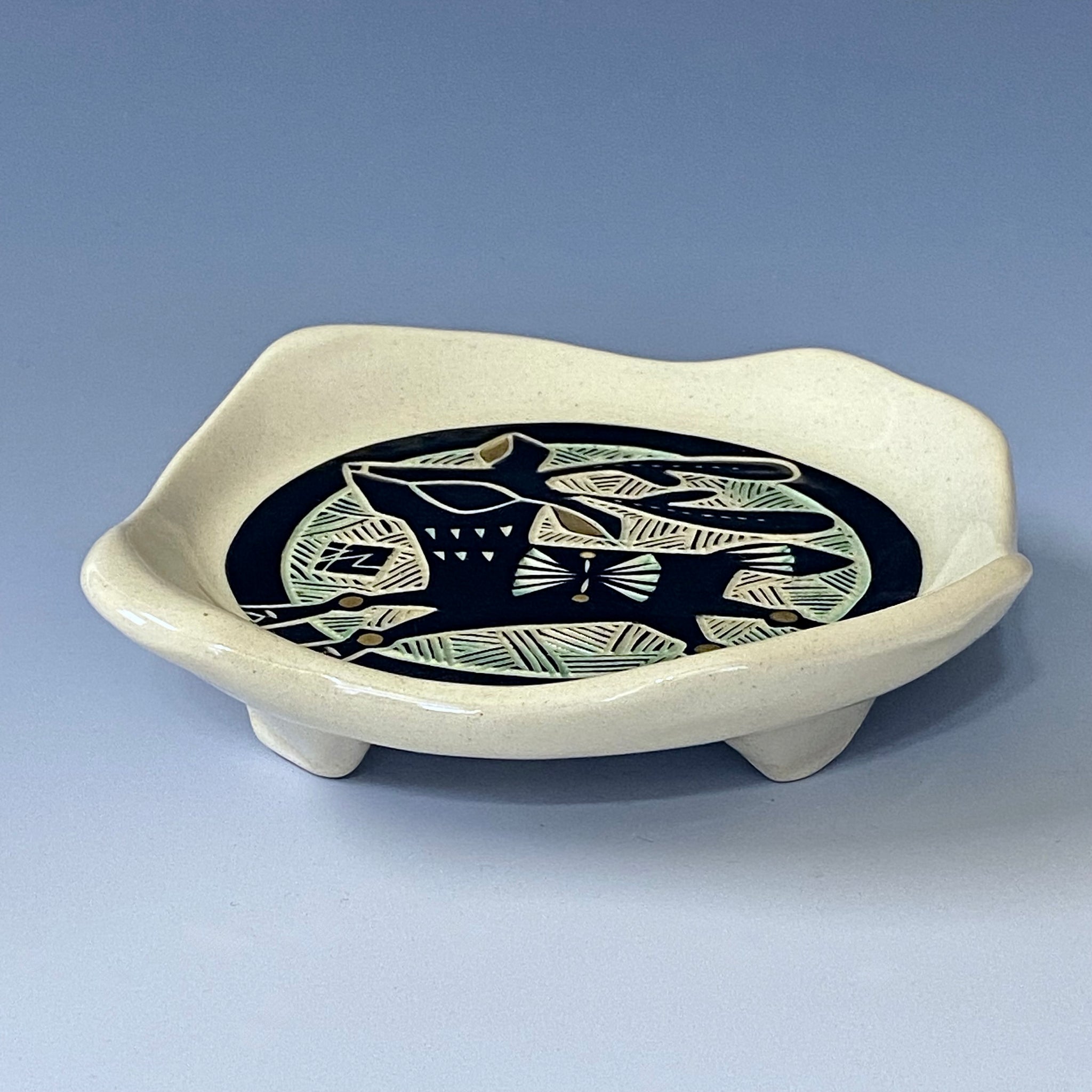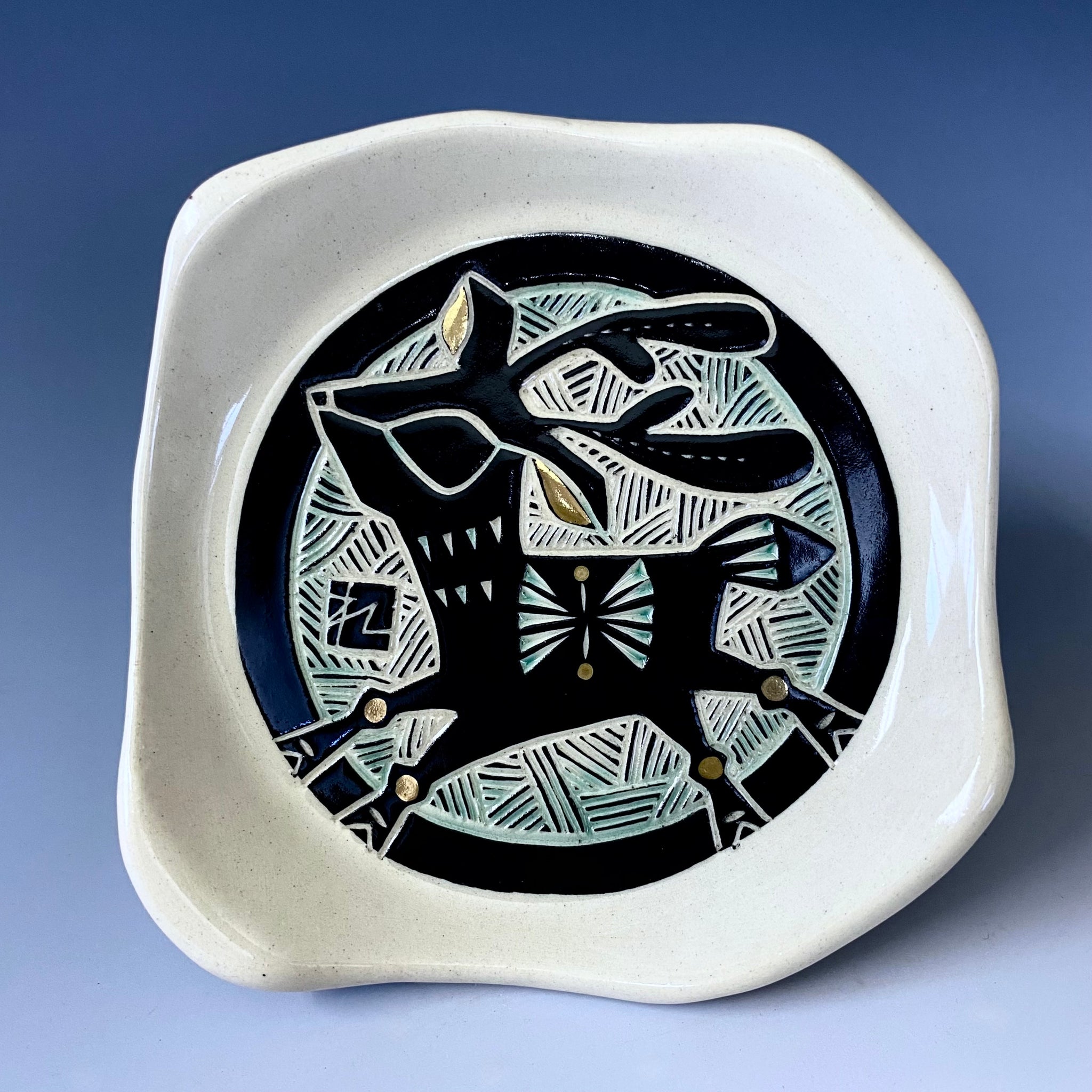 White stoneware with black underglaze, color glaze, sgraffito and gold luster decoration. With lead-free glaze is fully functional ware. Dishwasher safe but due to the metallic luster it must not be microwaved.