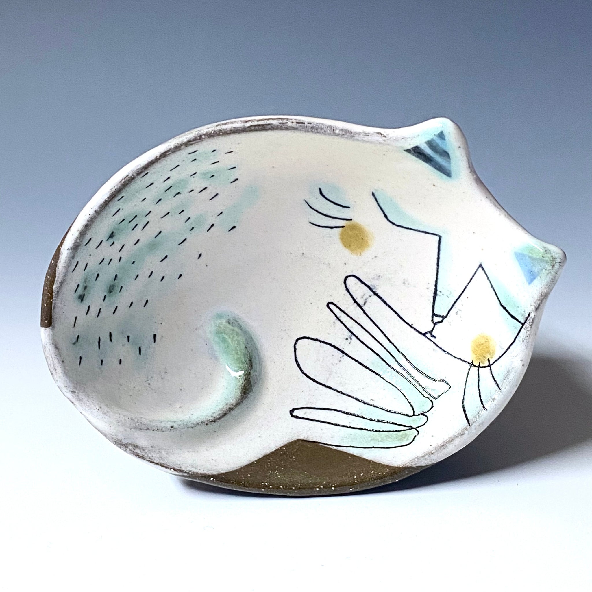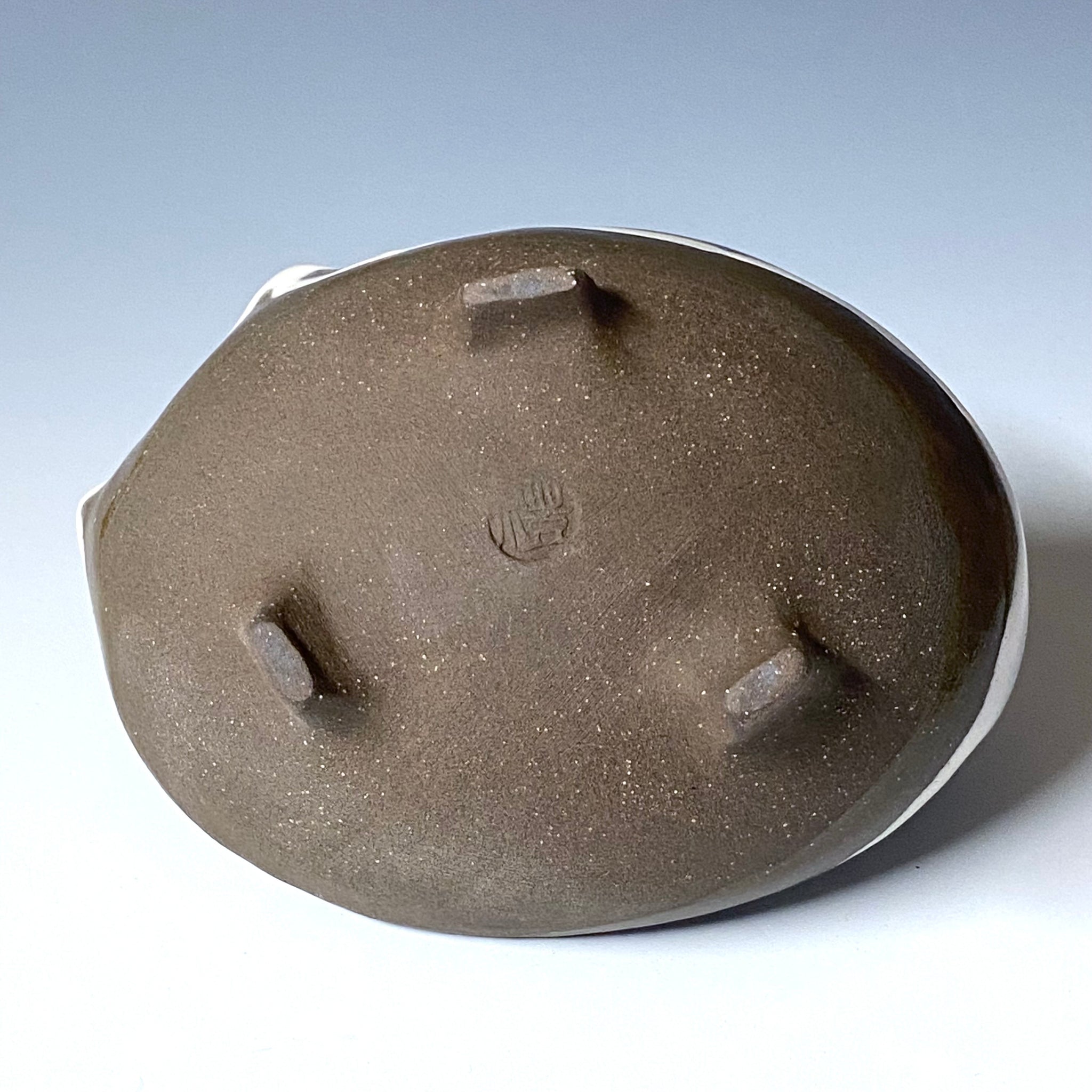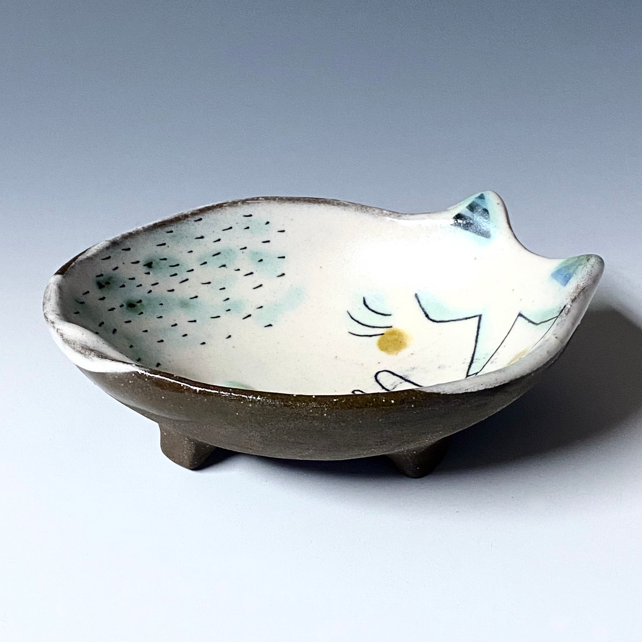 Brown stoneware with white slip, black underglaze, color glaze, line inlay, and sgraffito decoration.
