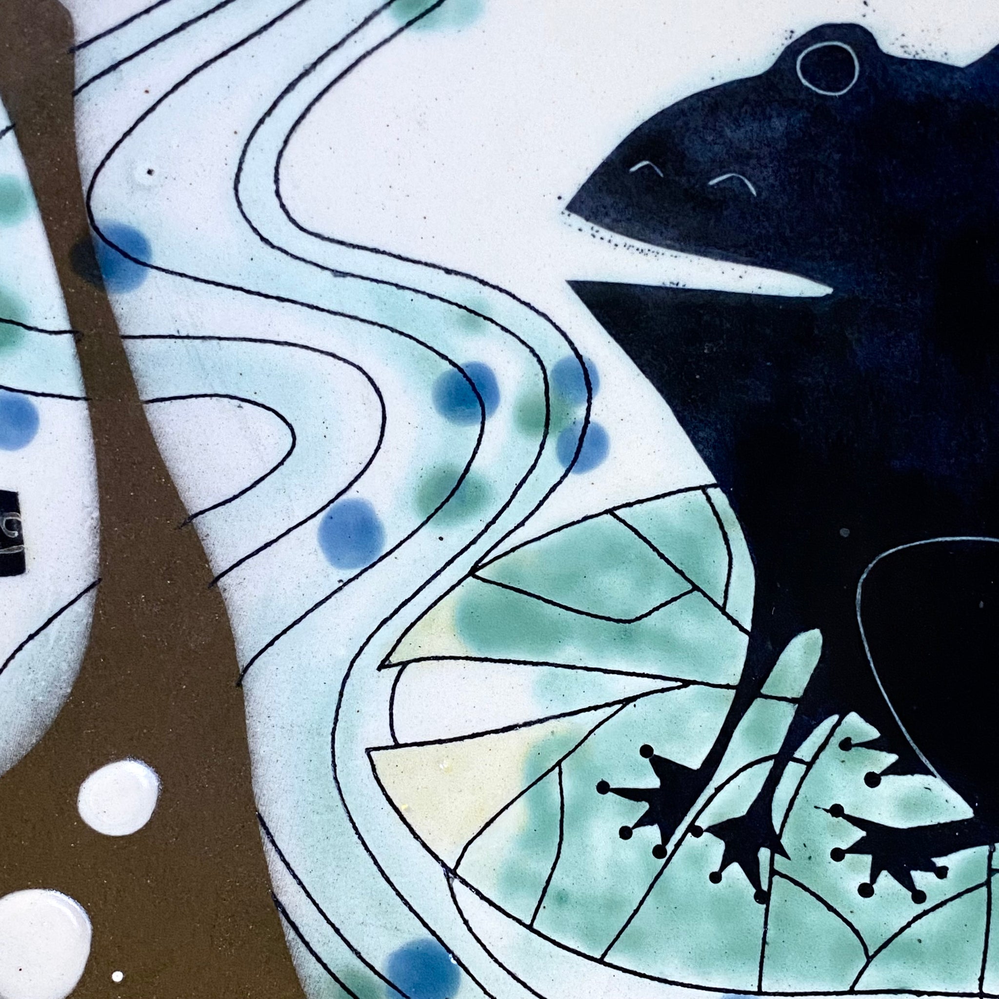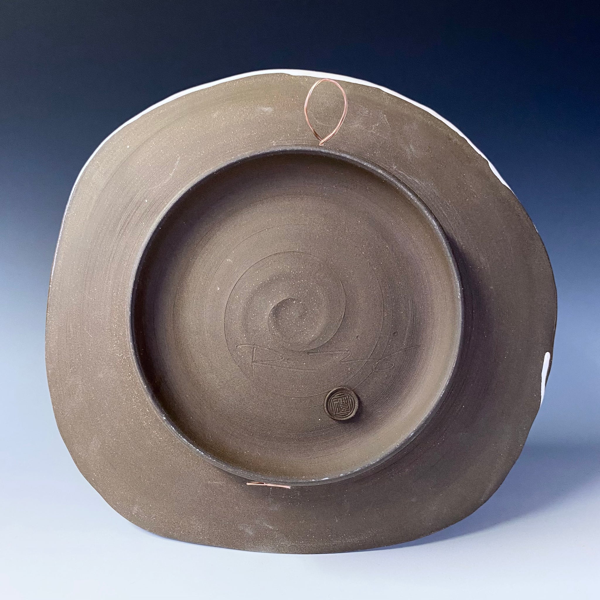 Brown stoneware with white slip, black underglaze, glaze stain, line inlay, and sgraffito decoration.