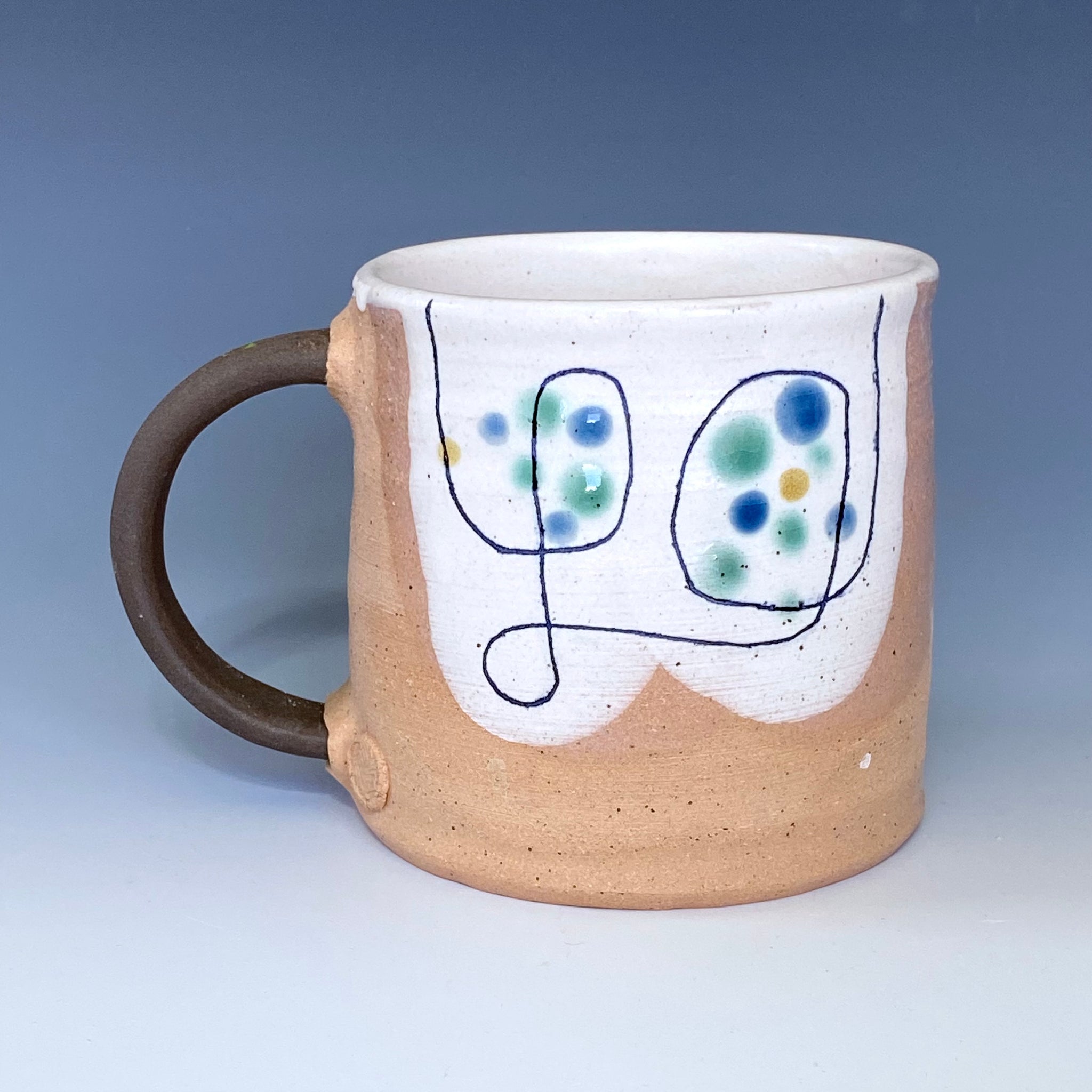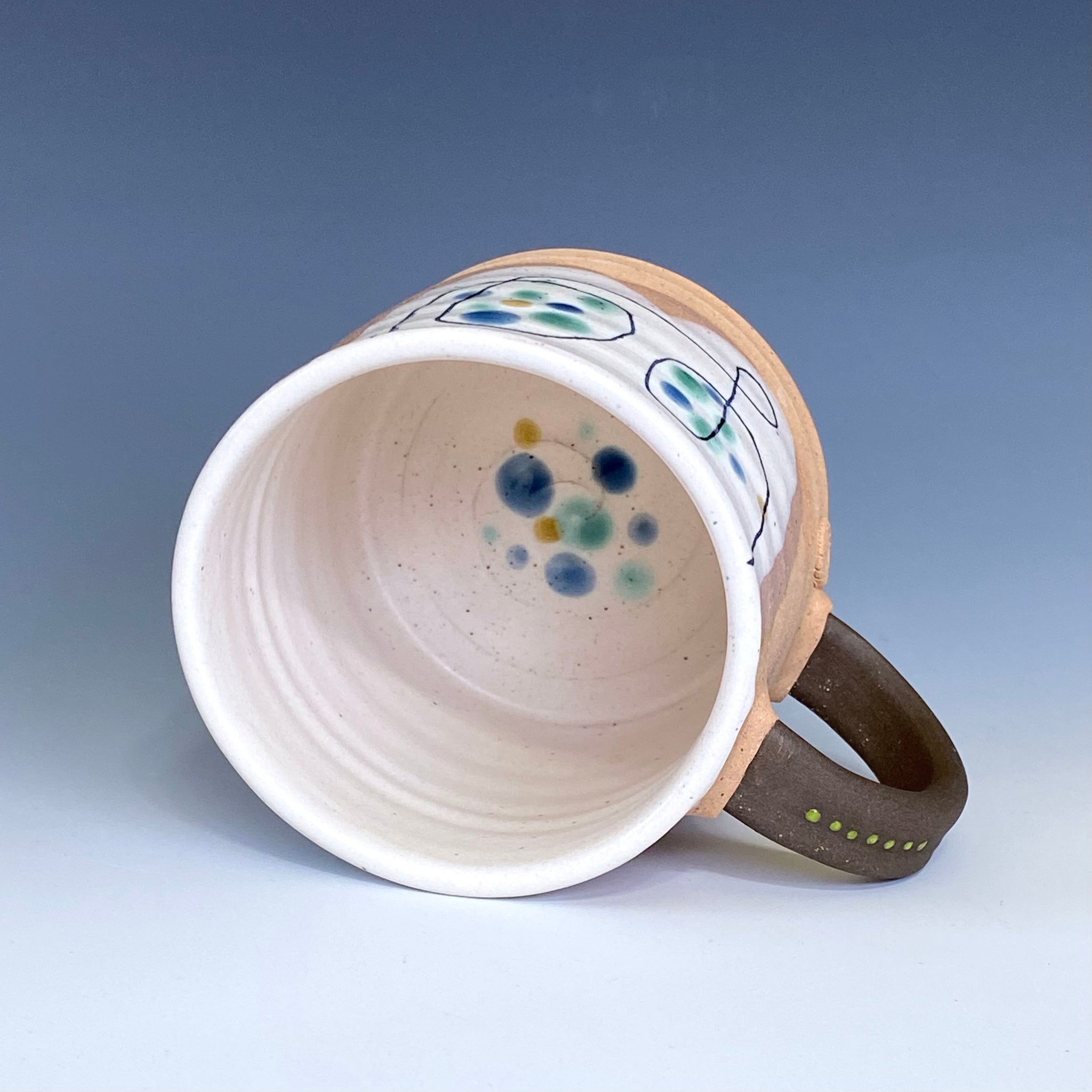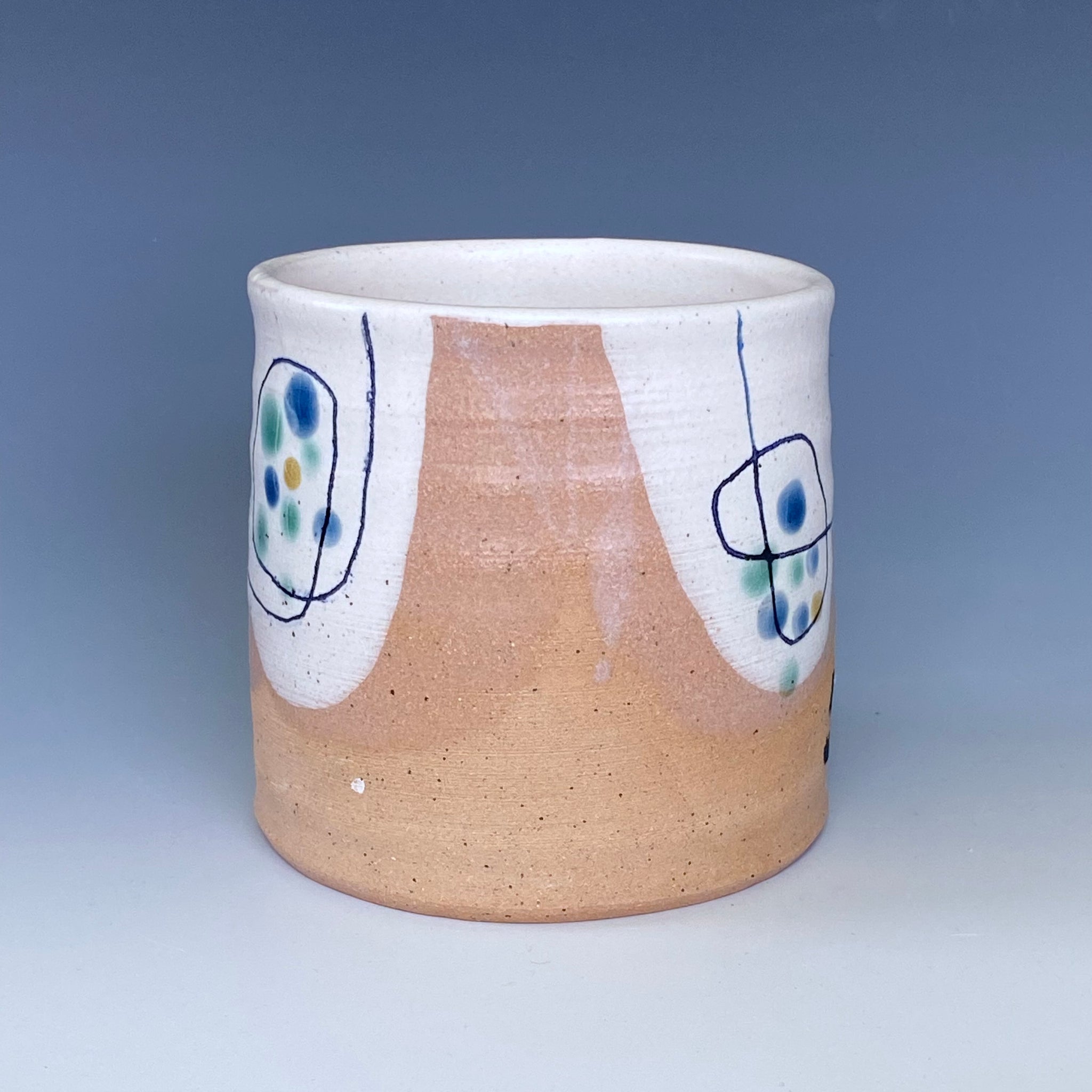 Red stoneware with white slip, color glaze, glaze stain, sgraffito and line inlay decoration.