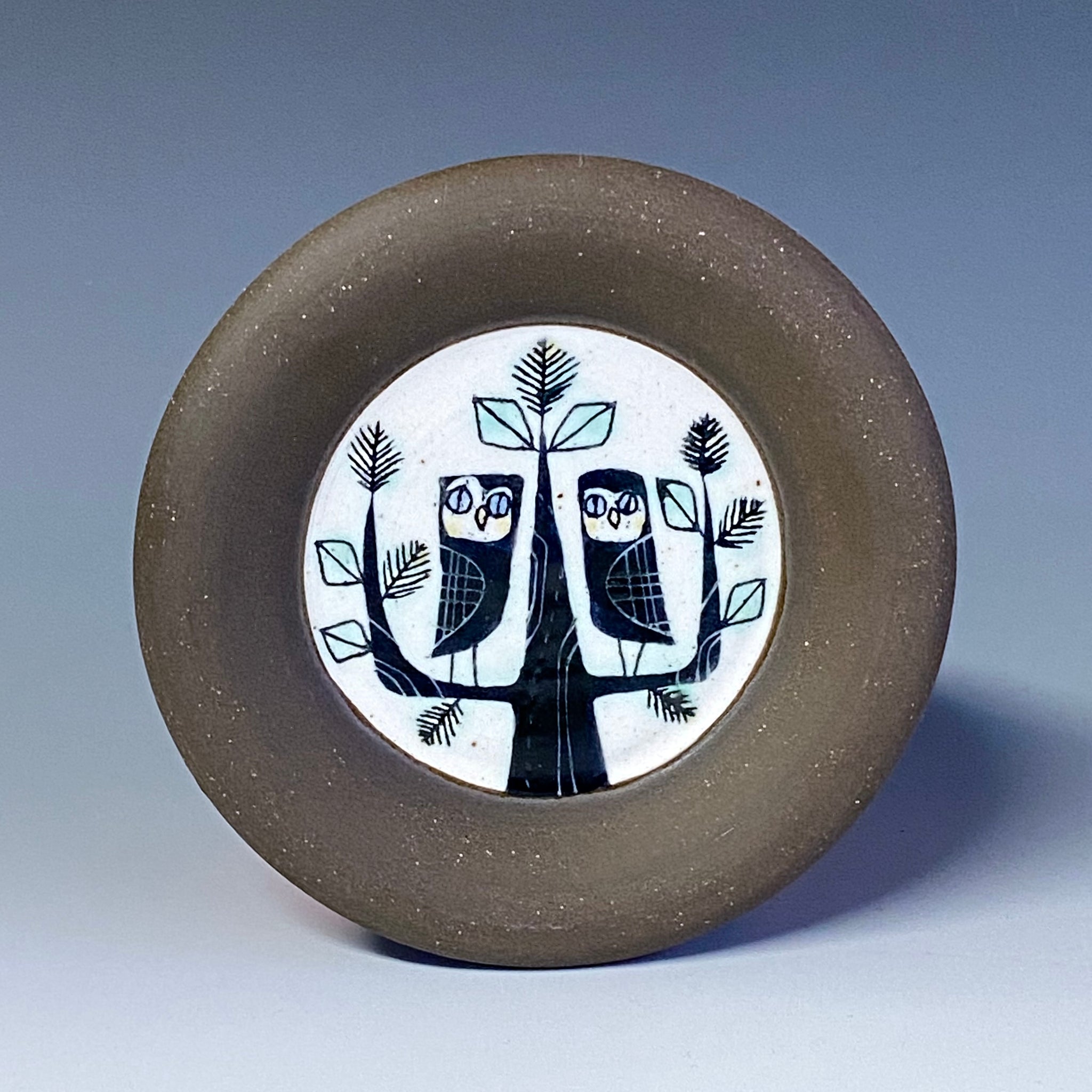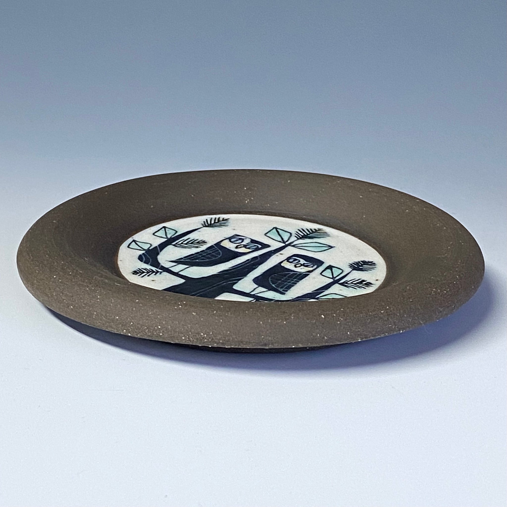 Brown stoneware with white slip, black underglaze, glaze stain, line inlay, and sgraffito decoration.