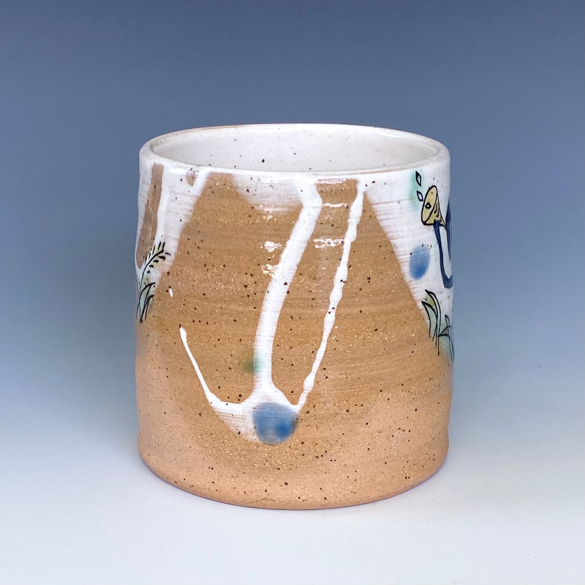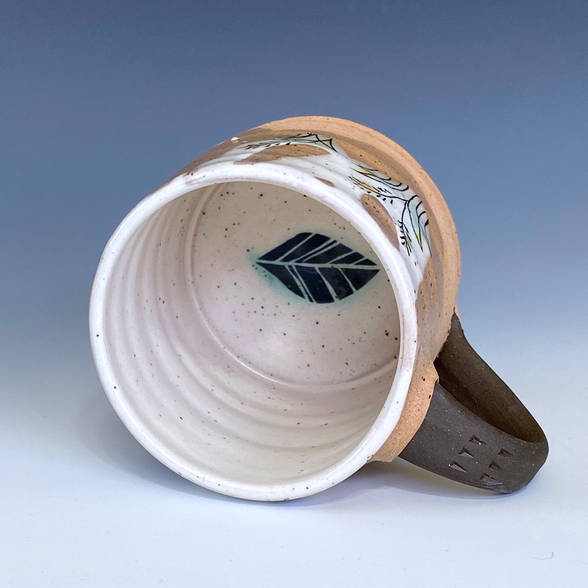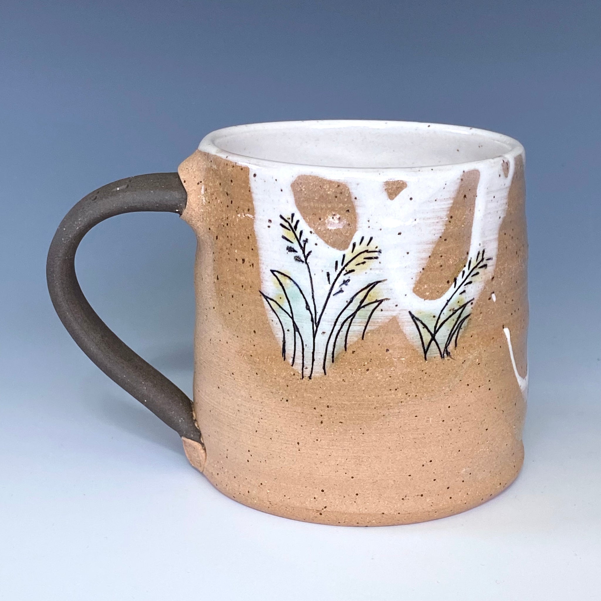 Red stoneware with white slip, color glaze, sgraffito and line inlay decoration.