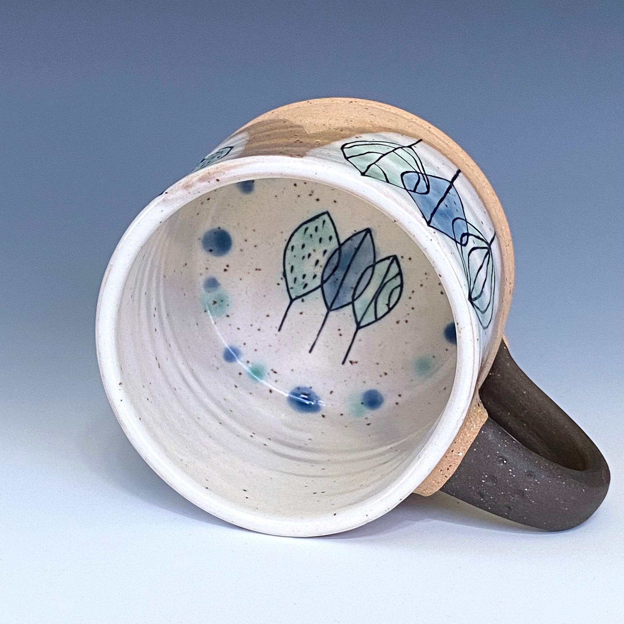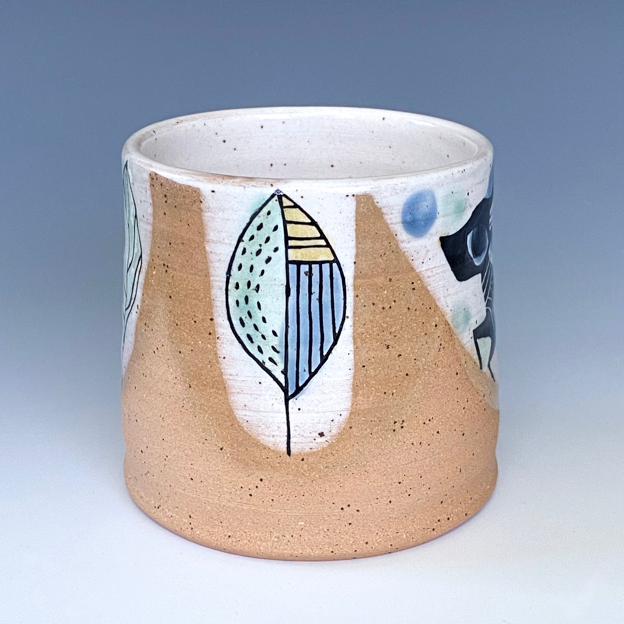 Red stoneware with white slip, color glaze, sgraffito and line inlay decoration.
