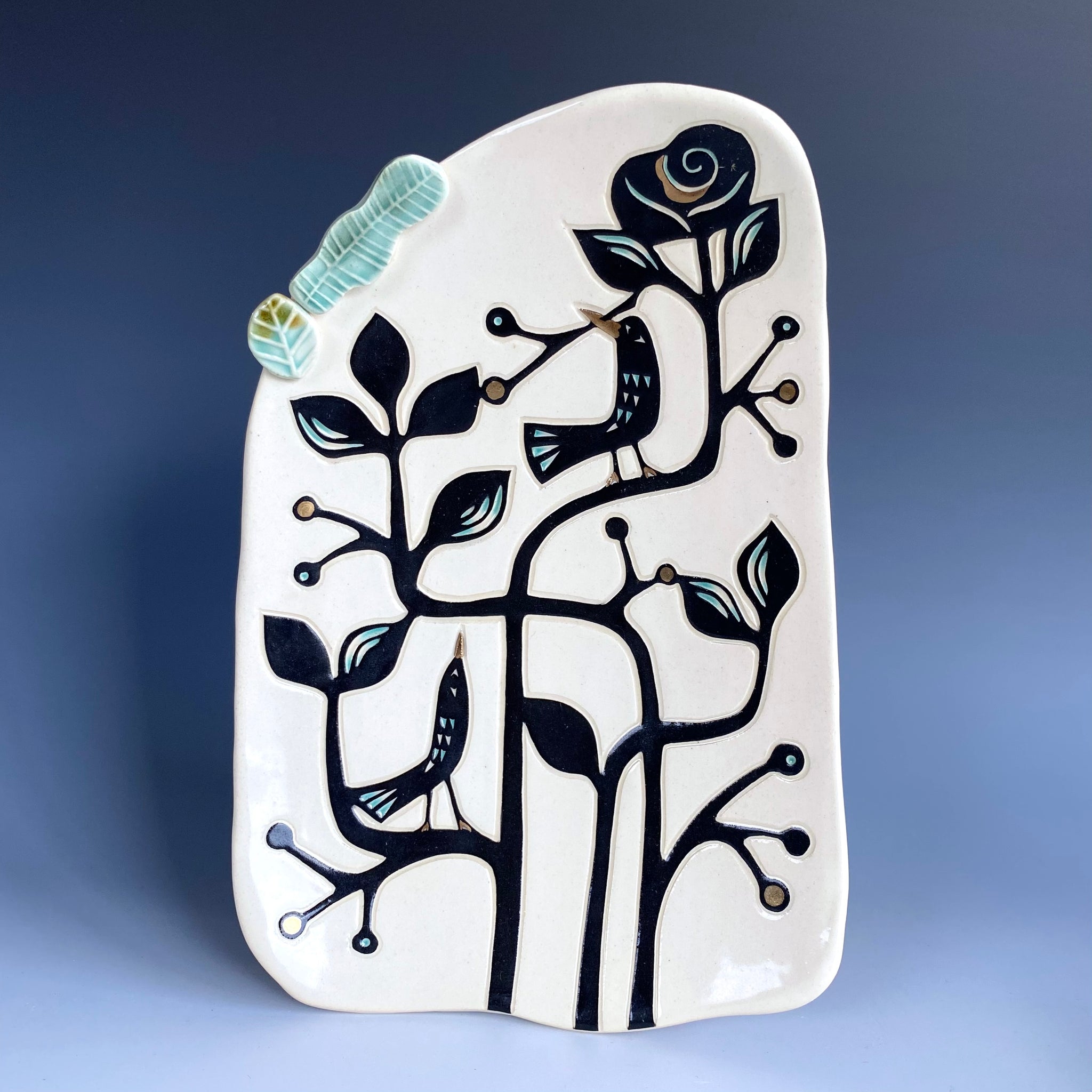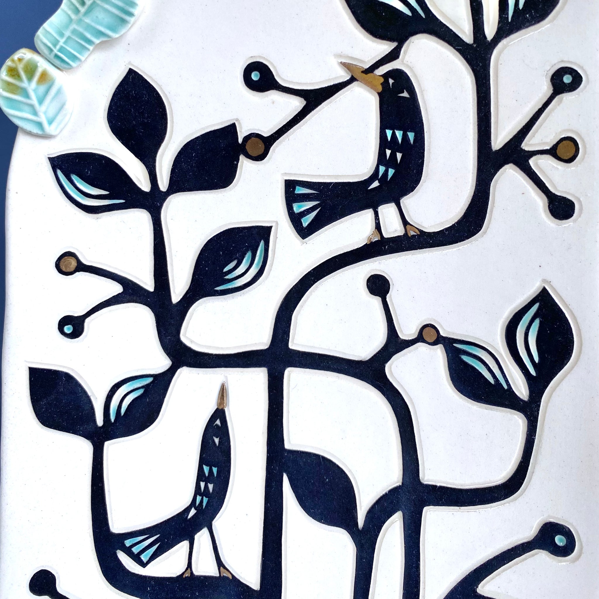 White stoneware with black underglaze, color glaze, sgraffito and gold luster decoration. With lead-free glaze is fully functional ware. Dishwasher safe but due to the metallic luster it must not be microwaved.